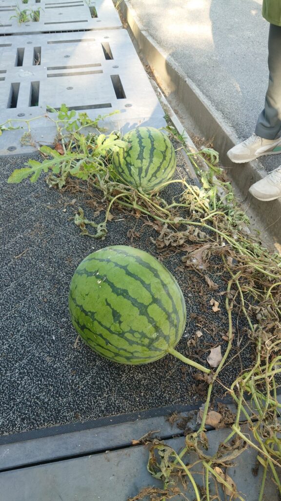 工場の敷地内に自然に生えてきたスイカ🍉※おやつ時間に食べて捨てたスイカの種から自生してきました。