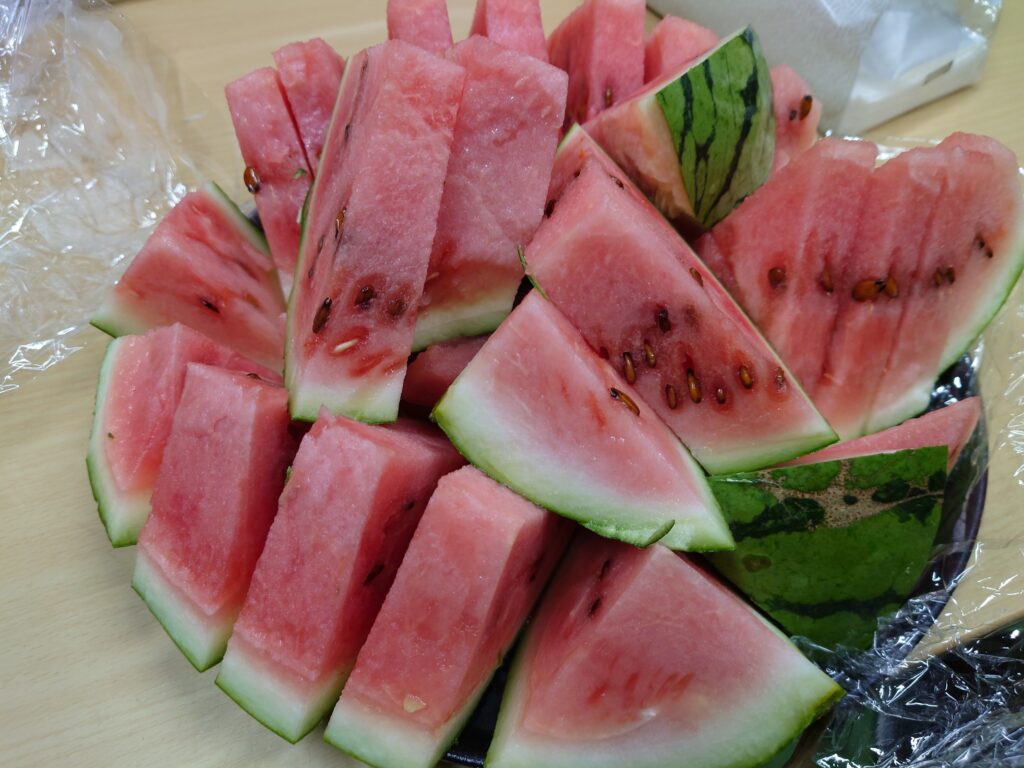 スイカを切ってみると、しっかりと赤く熟し、瑞々しくて甘いスイカでした!!スタッフ一同でおいしくいただきました。
