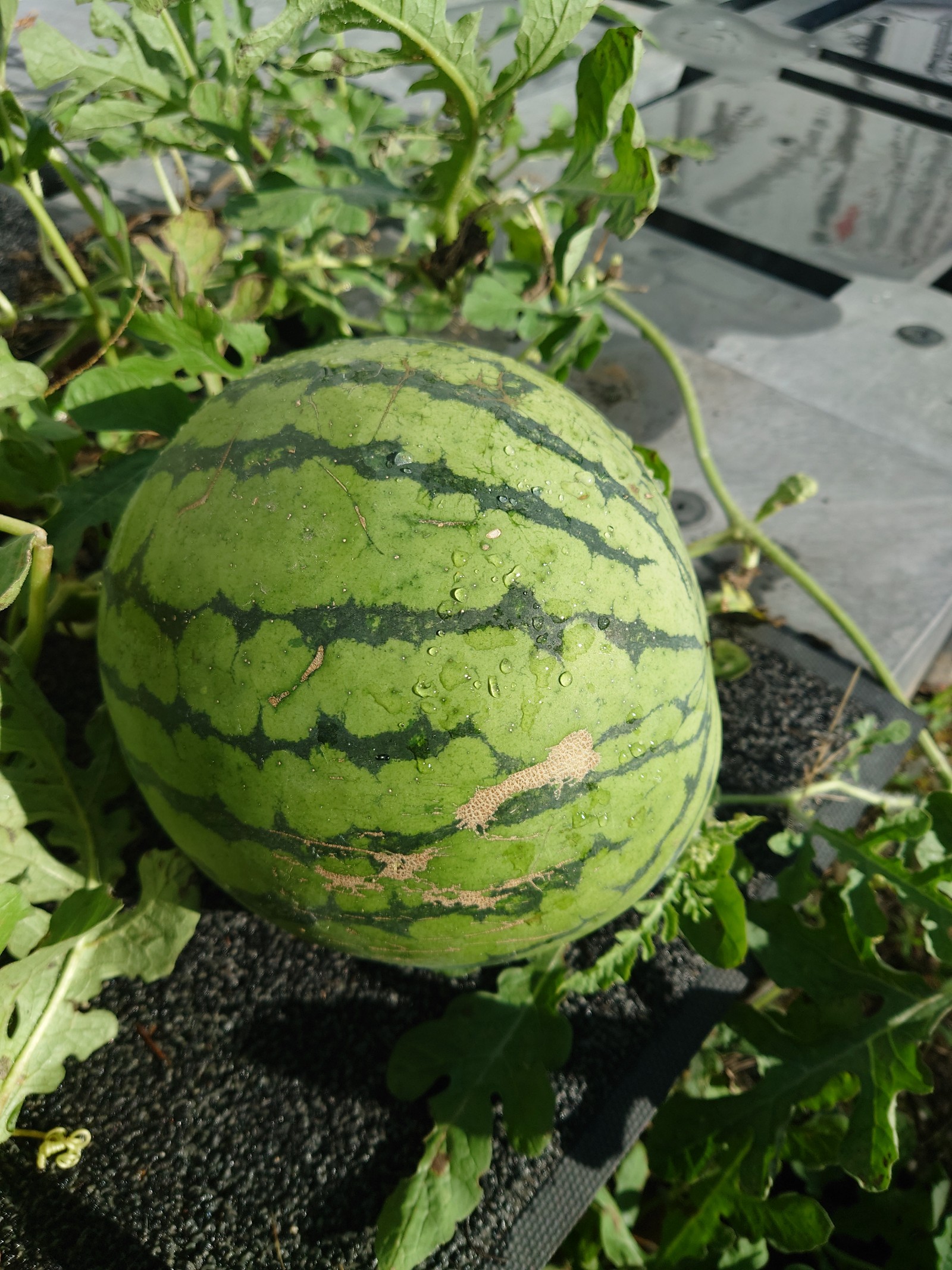 工場の敷地内に自然に生えてきたスイカ🍉※おやつ時間に食べて捨てたスイカの種から自生してきました。