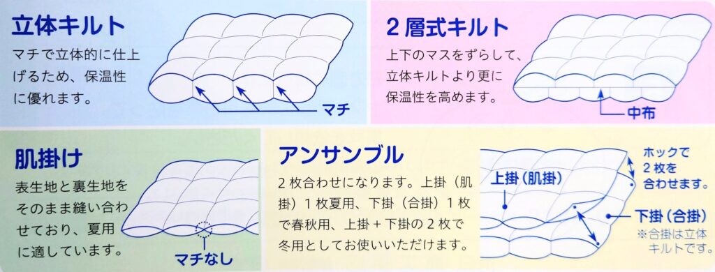 用途に応じて、自分に合ったキルトのタイプをお選びください。