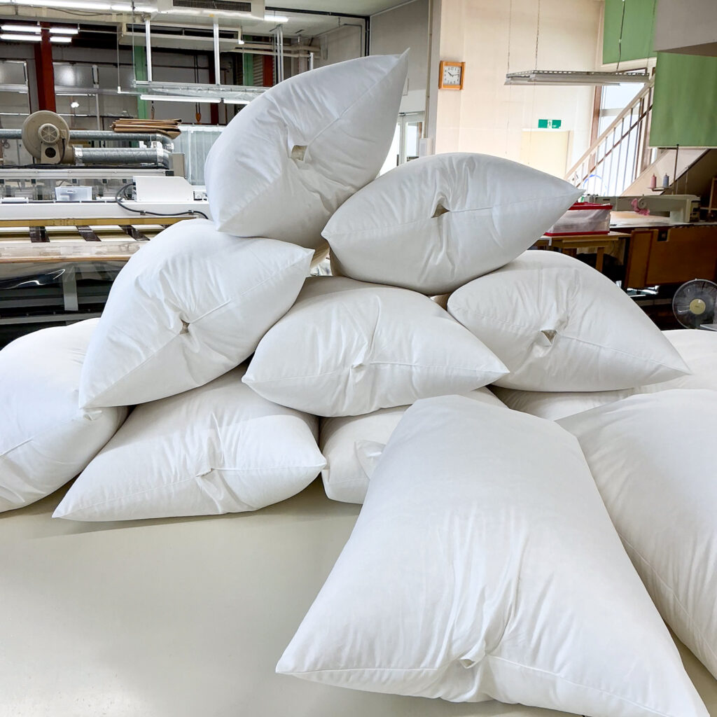 枕クッションのサイズ、使用生地、羽毛の種類はご希望に沿っておつくりすることが可能です。個人のお客様から事業者様向けに大口の数量の製造も対応できます。