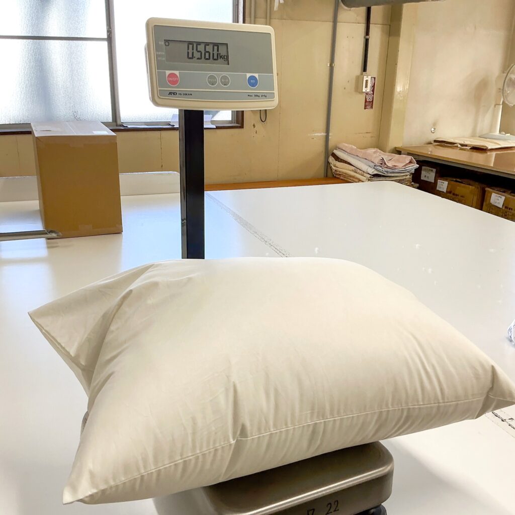 洗浄した羽毛を側生地に充填後、ひとつひとつ計量をして決められた充填量にしっかりとなっているかを確認しています。